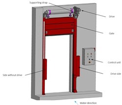 FX Keep can be used as a flood barrier against torrential rain. In the alternative, it can also be used as an automatic retractable drop down barrier to retain initial leakage of substances from storage areas and contaminated extinguishing agents from fire intervention. By default, the barrier is in the open position and allows unrestricted traffic.